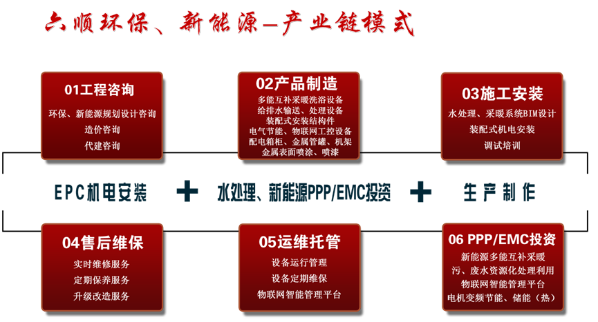 公司六大系列技術(shù)上相互支持、產(chǎn)品上相互配套的產(chǎn)品:PPP/EMC合同能源管理項目、新能源多能互補(bǔ)采暖CIA產(chǎn)品、給排水資源化處理利用產(chǎn)品、人工環(huán)境和彩色音樂藝術(shù)噴泉產(chǎn)品、電氣節(jié)能自控設(shè)備和物聯(lián)網(wǎng)智能管理平臺、配電箱柜及金屬管、罐、機(jī)架CIM。