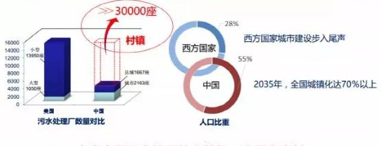 我國從“十一五”進入城鎮污水處理的高速發展期。目前,我國污水廠處理量已經超過了美國。(1)從數量上看,美國約有14000座污水廠,中國不到4000座;(2)從規模上看,美國大型污水處理廠有1050座,小型的有13950座,在我國縣城污水處理廠1667座,城市污水處理廠2163座,村鎮污水處理廠有大約30000座。因此,今后投資的重點和解決的重點,一定是農村。
