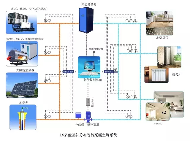 六順電氣依靠多年來在建筑給排水暖通和電氣工控等方面積累的人才和技術優勢,開發出能源互補分布智能的建筑采暖空調系統,是在滿足人們舒適居住環境的前提下,采用如:低谷電能,水(地)源,空氣泵,地熱低溫水,太陽能、風能、生物質能、天然氣等等清潔能源,互補+分布末端供給方式+谷電低成本儲熱+末端環境智能監反饋測調節等綜合技術工藝,通過相變儲能技術,選擇使用廉價、清潔和方便的能源。大限度的減少建筑采暖空調能耗的使用成本,多源互補。