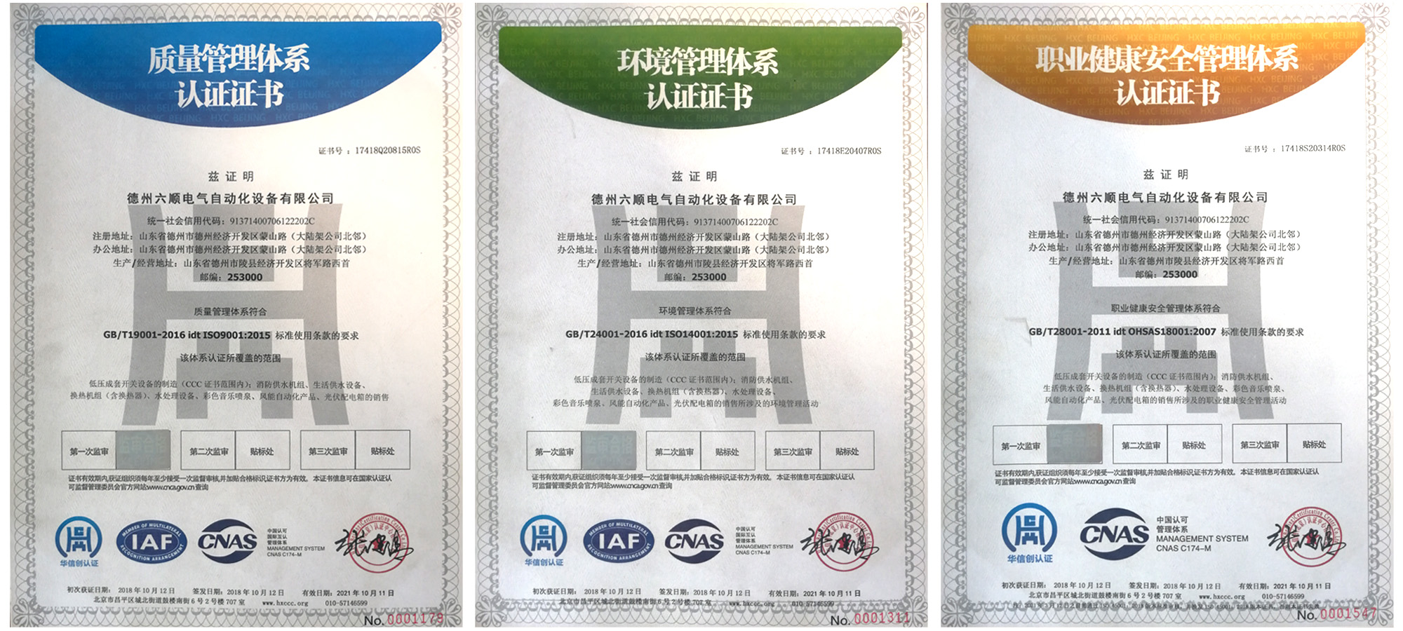 2020年9月18日,德州六順電氣自動化設備有限公司接待北京華信創認證中心專家審核組,經過兩天嚴格審核,順利通過ISO9001-2015質量管理體系、ISO14001-2015環境管理體系、OHSAS18001-2007職業健康安全管理體系的年審檢驗。