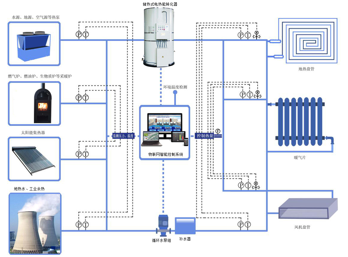 采用多能互補、分布智能的建筑采暖空調系統。該系統是在滿足人們舒適居住環境的前提下,充分利用鼓勵建筑采暖空調用電“削峰填谷”的低價優惠政策。采用谷電低成本儲熱加風、光、水、火、生等諸多清潔能源互補和采暖末端環境智能監反饋調節等綜合技術工藝,將高效遠紅外線炭纖維電熱能轉化技術、高效儲熱技術和物聯網智能化監控技術相結合,實現了建筑采暖的清潔環保、節能省錢和方便穩定等多重目的。