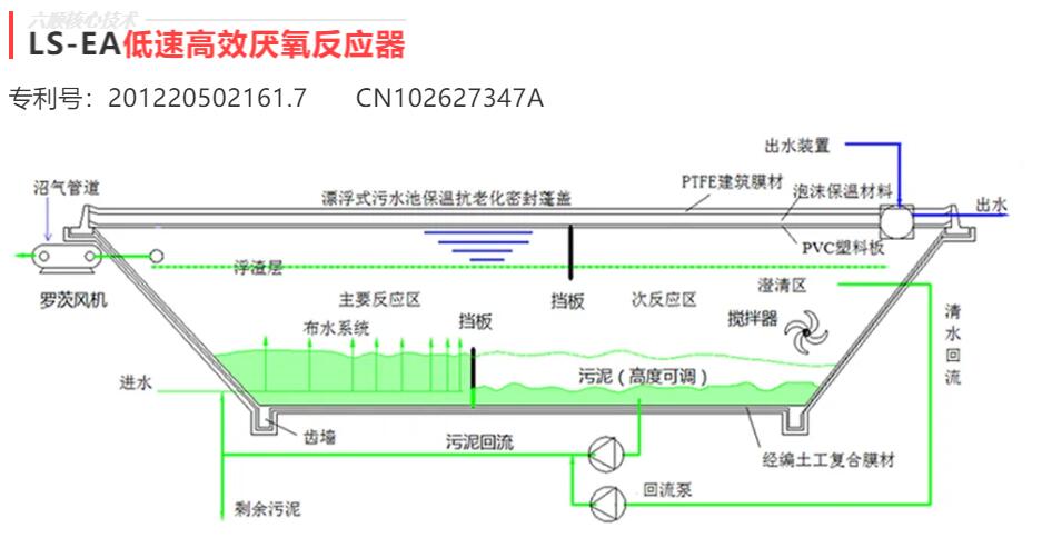LS-EA低速高效厭氧反應(yīng)器是現(xiàn)代建筑膜材和先進(jìn)的厭氧反應(yīng)控制理論相結(jié)合的成果,實(shí)現(xiàn)了污水處理的資源化利用。反應(yīng)器池體為長(zhǎng)方梯形結(jié)構(gòu),池型特點(diǎn)滿足厭氧反應(yīng)器內(nèi)水力推流攪拌和固、液、氣的分離的需要,復(fù)合膜材料作為防滲材料無(wú)需要專用三相分器,無(wú)需復(fù)雜的布水回流系統(tǒng),出水沉淀區(qū)確保出水固液分離。