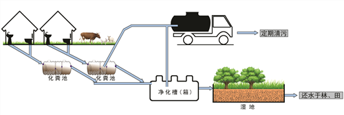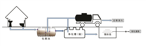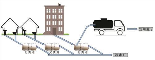采用簡單處理工藝,去除大型固形物(塑料、樹枝等)后經二級化糞池處理后,上清液經排水管網集中排放至污水處理廠。