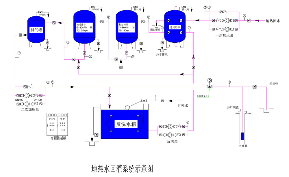 地?zé)崴毓嗾w機(jī)組,主要是由除砂器、粗過(guò)濾、細(xì)過(guò)濾、排氣罐、加壓泵及自動(dòng)化控制系統(tǒng)組成一體。